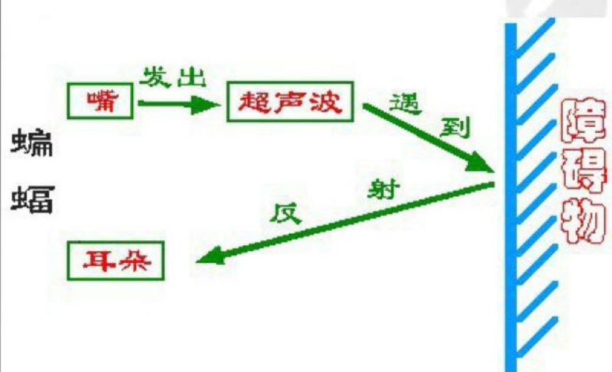 蝙蝠用喉部发出频率高、波长短的超声波,然后通过听觉系统听物体反射的回声,大脑中枢分析并作出反应。喉部产生短促而高频的超声波( > 20 kHz) ,经鼻或嘴传出后被附近物体反射回来形成回声,回声被外耳接收,以神经电信号传递至听觉神经中枢,听觉中枢对回声本身、发出声与回声间的差异进行分析,从而确定前方物体的位置、大小、形状、结构以及运动速度与方向,比如,回声与发出声之间的时间间隔蕴含着距离的信息,两耳回声强度差蕴含着方向位信息,蝙蝠声呐在识别障碍物的性质方面非常精确,甚至可以通过简单地分析每个频率反射声波的振幅来区分昆虫、树枝或树叶!