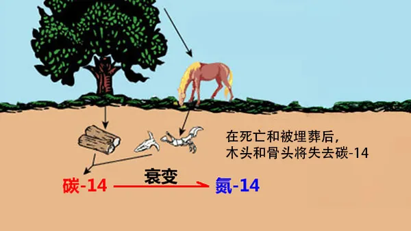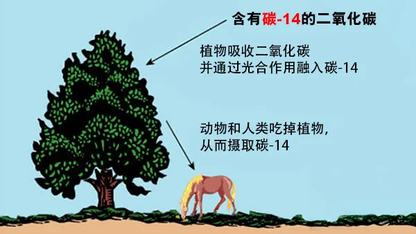地球大气中有少量含碳-14的二氧化碳,植物会将其不断吸入,而动物也通过吃植物(或植食动物)不断摄入碳-14。