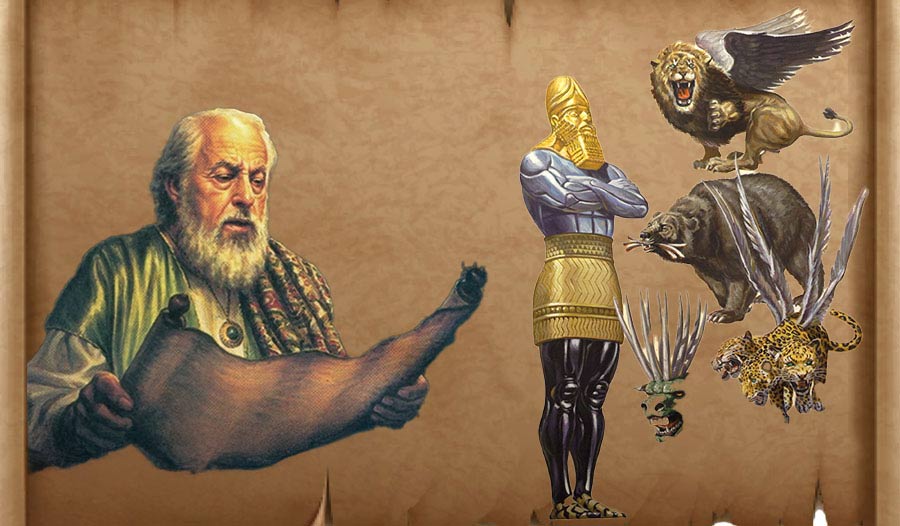 但以理书7:3有四个大兽从海中上来,形状各有不同:4头一个像狮子,有鹰的翅膀……5又有一兽如熊,就是第二兽,旁跨而坐【挺着一边身躯】,口齿内衔著三根肋骨。……又有一兽如豹,背上有鸟的四个翅膀;这兽有四个头……第四兽⋯⋯有大铁牙,吞吃嚼碎,所剩下的用脚践踏。 这兽与前三兽大不相同,头有十角。